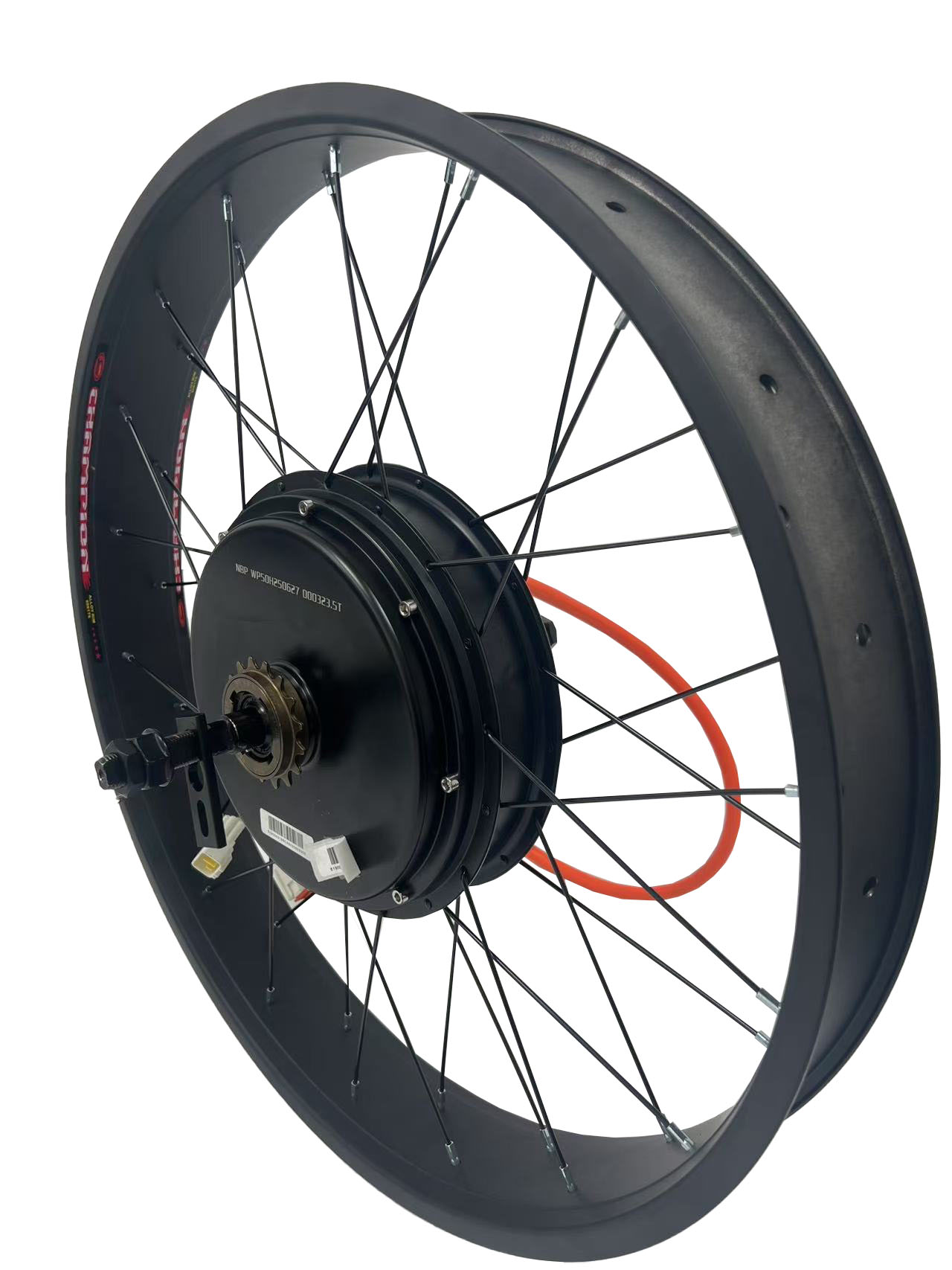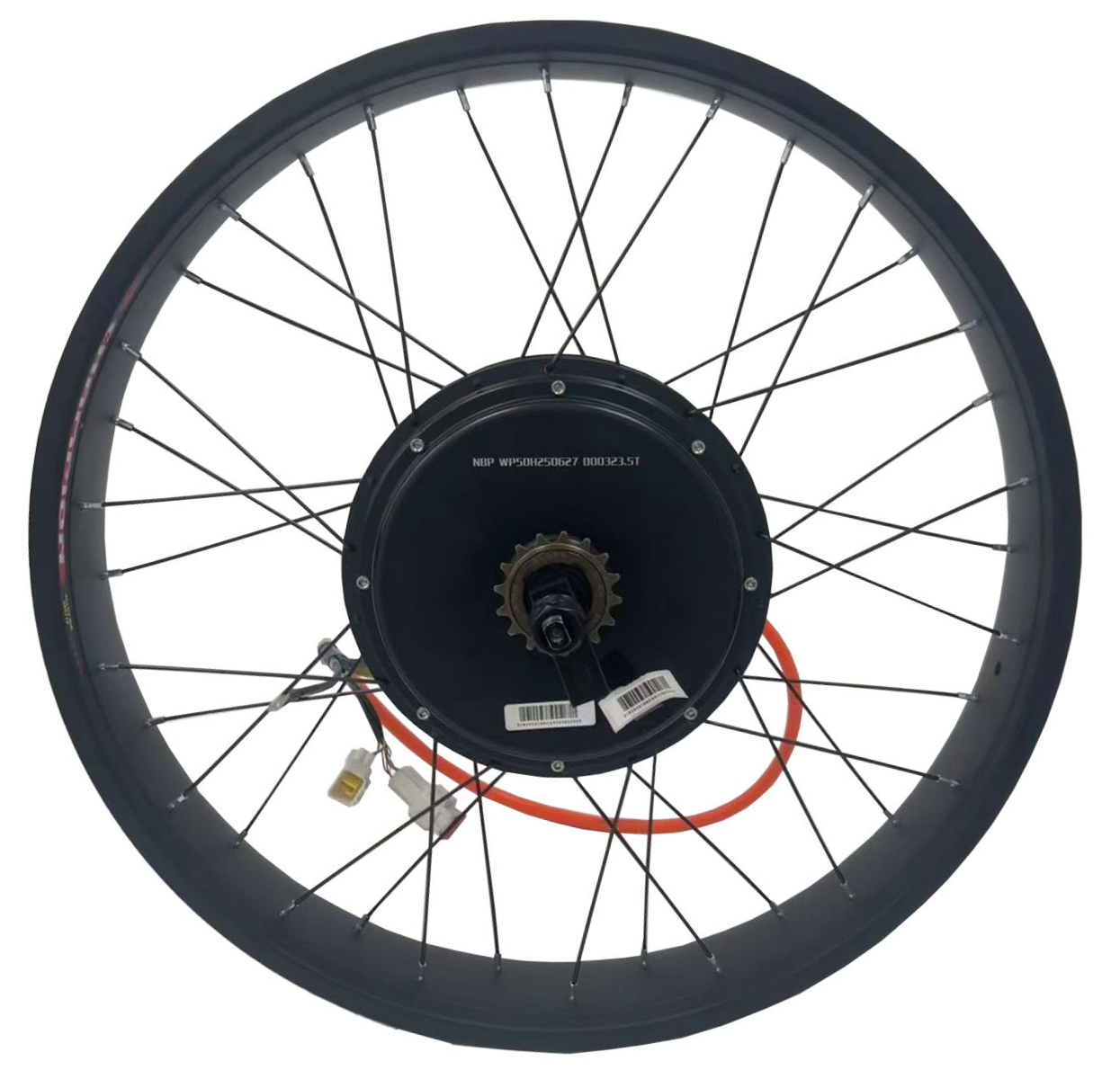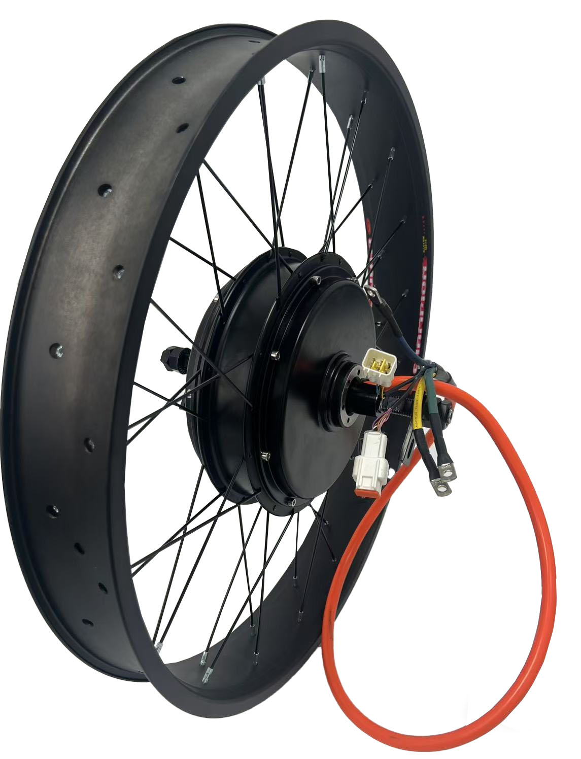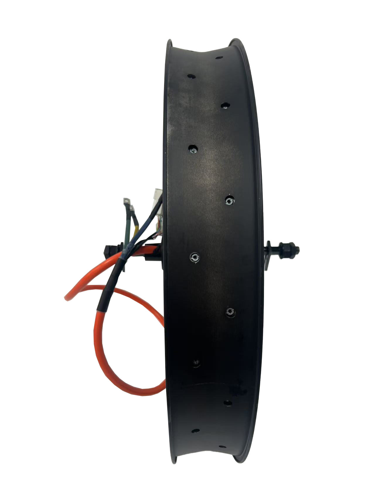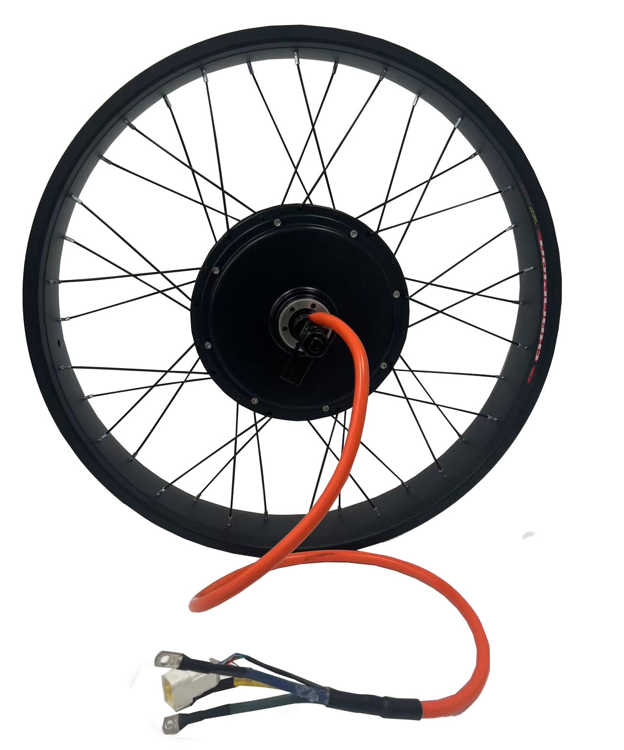 5000W1. Motor Type: BLDC In-Wheel Hub Motor2. Motor Design: Double Axle with Rim(integrated)3. Matched Tire: 20inch 24inch 26inch4. PCD: 6*44mm5. Stator: Aluminum Core6. Rated Power: 5000W7. Peak Power: 10000W in few seconds8. Rated Voltage: 72V9. Speed:3.5T: 840RPM4T: 770RPM5T: 650RPM10. Drop-outs: 170mm or 190mm11. Max Torque:3.5T: 180N.M4T: 200N.M5T: 220N.M12. Max Efficiency: approx 91%13. Suggest Peak Phase Current: N/A14. Thermic Probe: KTY83/122(as default)15. Working Temperature: 70-120℃, peak 150℃16. Brake Type: Disc Brake17. Hall Sensor: Dual hall set with waterproof connector18. Phase Wire:2*5mm²Cross19. Hall Sensor Phasing Angle: 120 degree20. Waterproof Grade: IP65